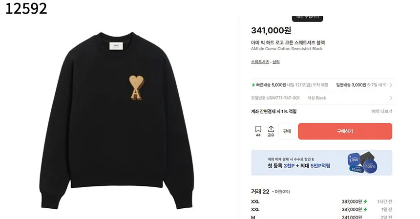 아미 빅 하트 로고 코튼 스웨트셔츠 블랙 #12592